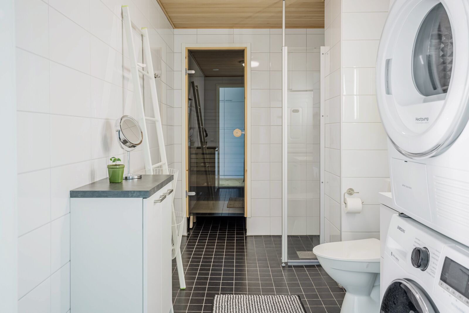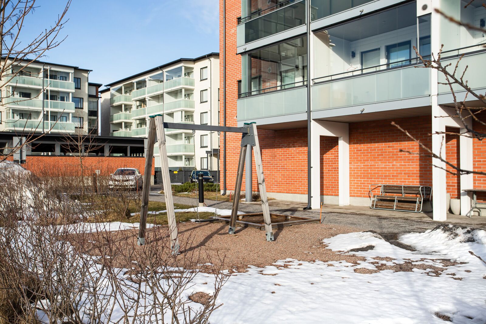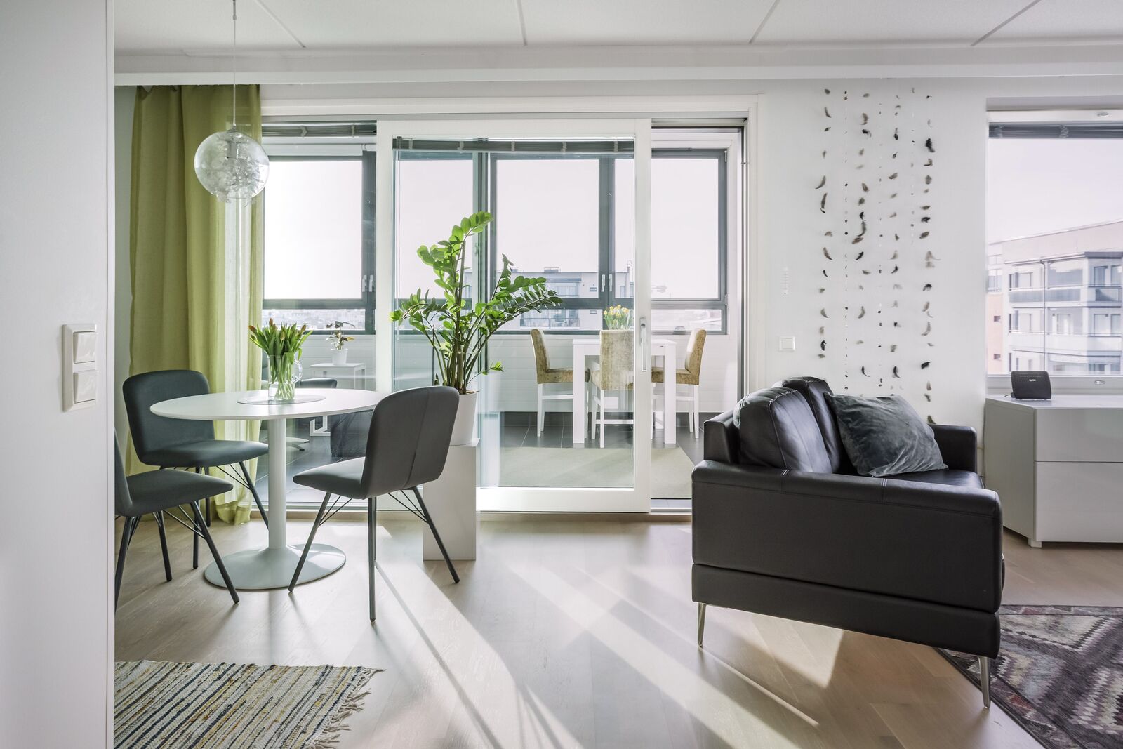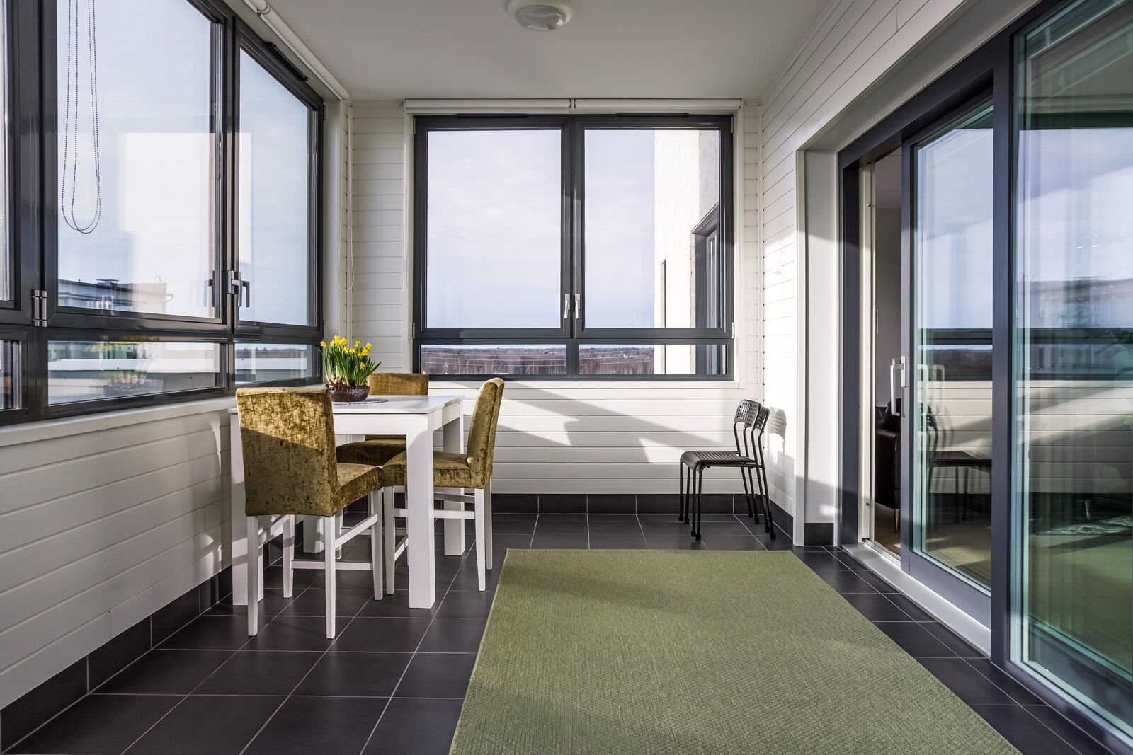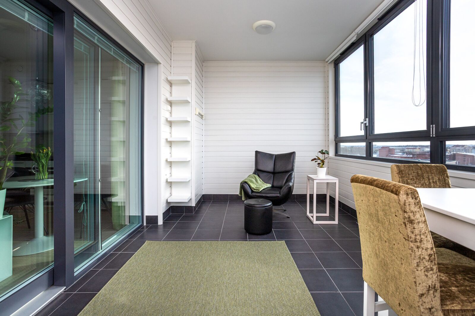 Puolilämmin iso parveke/terassi antaa lisätilaa eri vuodenaikoina, kun on lattialämmitys.
