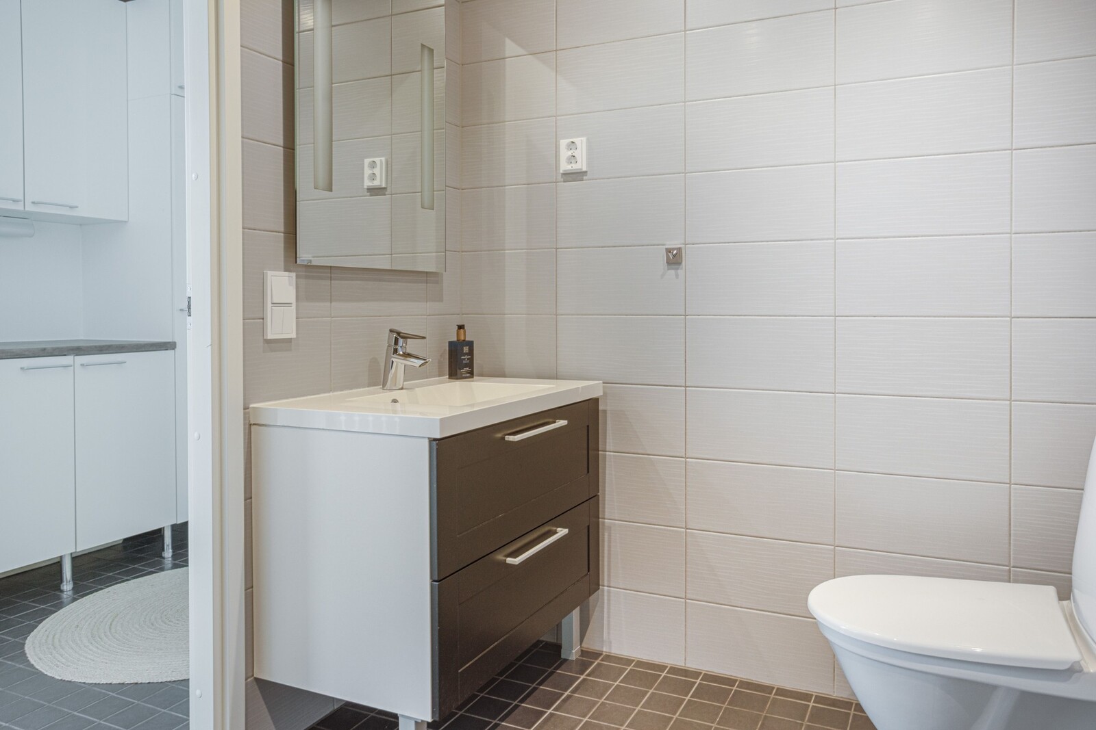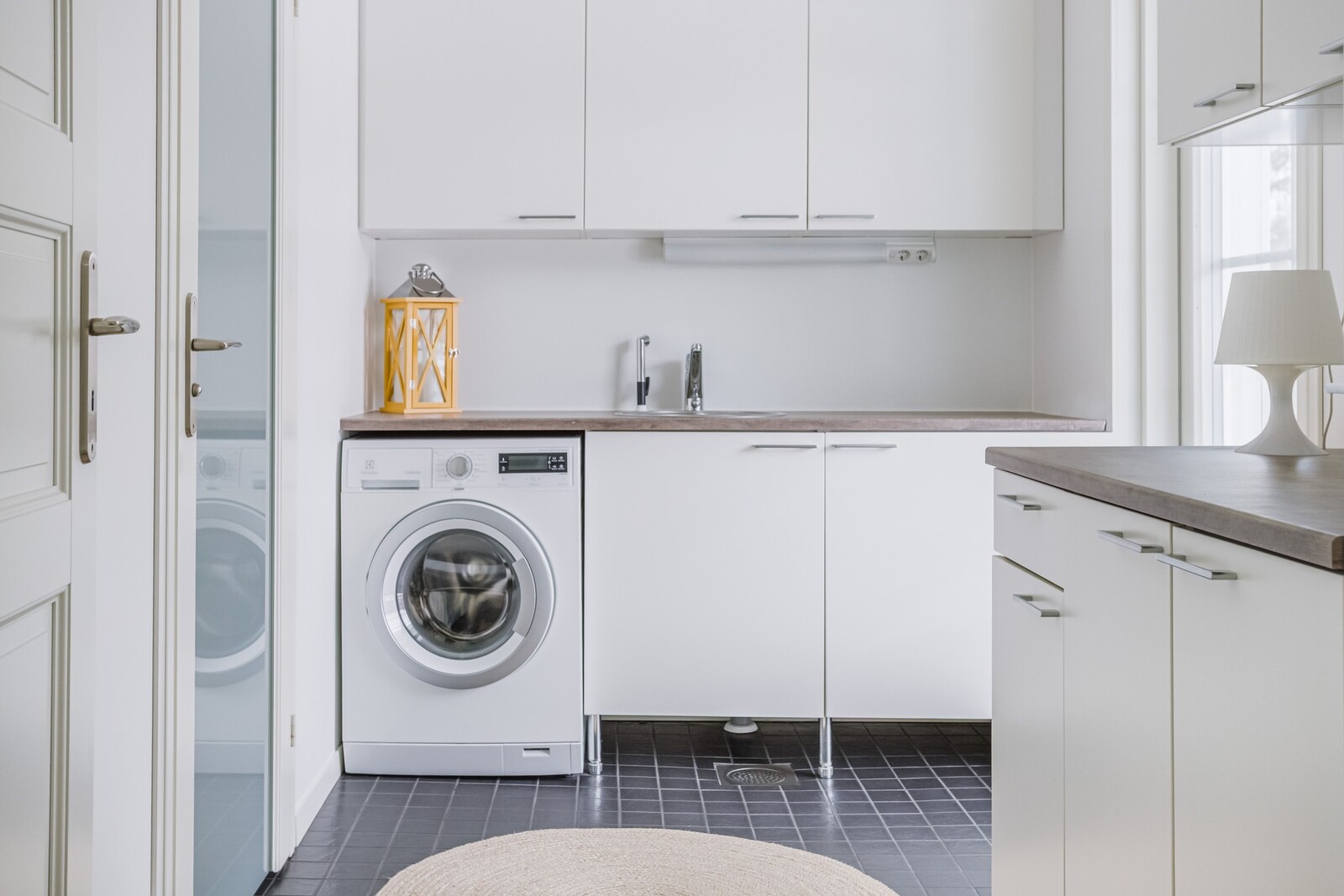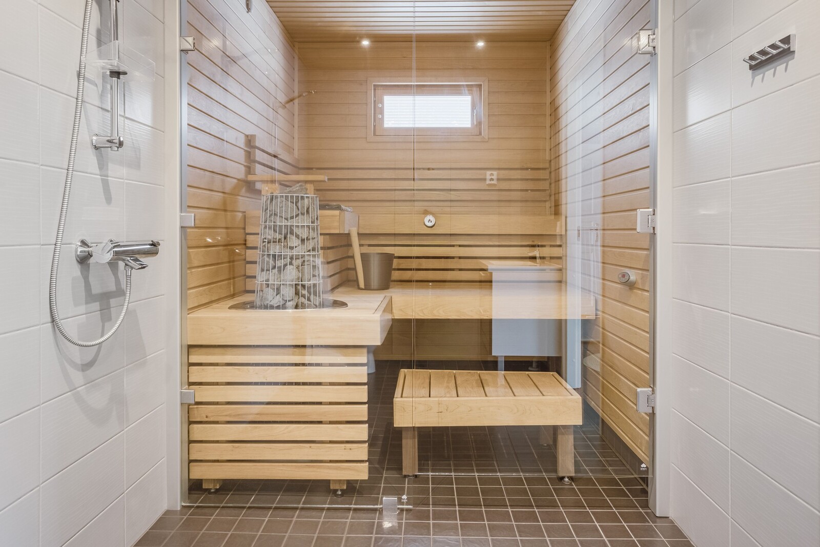 Kodinhoitohuoneesta on käynti suoraan ulos. Samassa tilassa löytyy myös sauna ja pesuhuone.